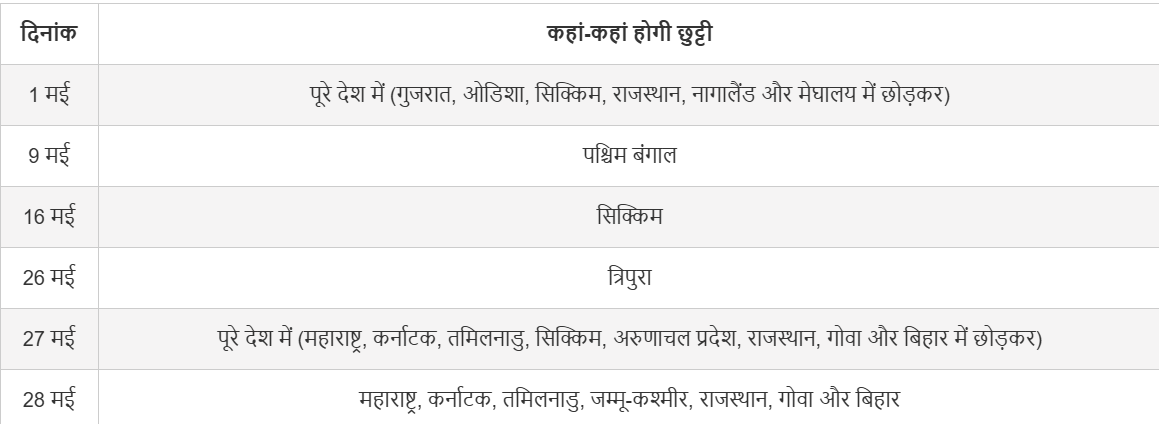 3, 10, 17, 24 और 31 मई को रविवार है, जबकि 9 और 23 मई को दूसरे और चौथे शनिवार की वजह से बैंक बंद रहेंगे।